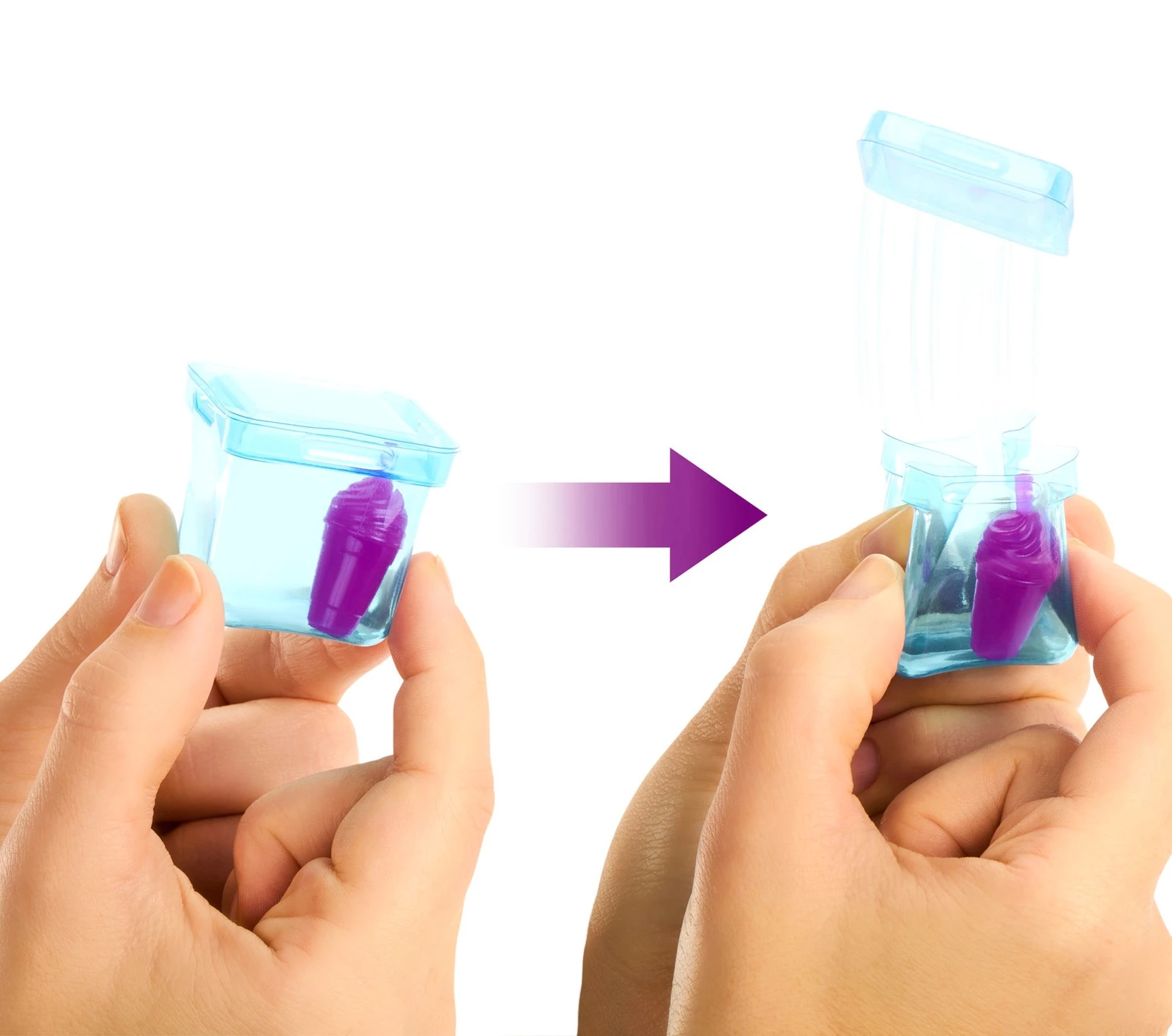 ➡️Po zdjęciu wierzchniej warstwy opakowania otwórz kubek i wyjmij torebki-niespodzianki. Potem ponownie zamknij pokrywkę i przebij górną część „słomką”, aby wylać slime na „kostki lodu”.