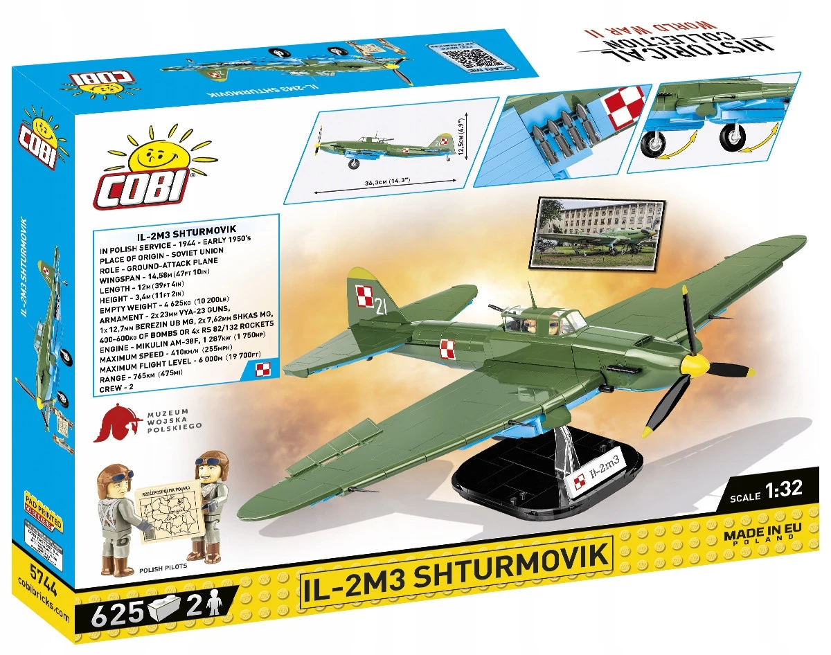 Samolot IŁ-M3 został zaprojektowany z klocków konstrukcyjnych COBI w skali 1:32 przy wykorzystaniu nowych elementów. Za wzór posłużył jeden z nielicznych, oryginalny samolot znajdujący się na ekspozycji plenerowej Muzeum Wojska Polskiego w Warszawie. Klockowy model oferuje wiele ruchomych elementów takich jak obracające się śmigło, ruchome lotki skrzydeł czy koła z gumowymi oponami, które można złożyć do pozycji poziomej. Odwzorowane zostały detale i powojenna kolorystyka samolotu oraz uzbrojenie (w tym rakiety). Uwagę zwraca błękitny spód z szachownicami. Kokpit, którego osłona została zaprojektowana na nowo, można otworzyć, by posadzić w fotelach figurki pilota oraz strzelca. Dzięki specjalnej podstawce, ekspozycyjnej z tabliczką zawierającą nazwę samolotu oraz miejsce na przyczepienie figurek cały zestaw prezentuje się znakomicie! Figurki zostały opracowane na podstawie umundurowania znajdującego się w zbiorach Muzeum Wojska Polskiego.