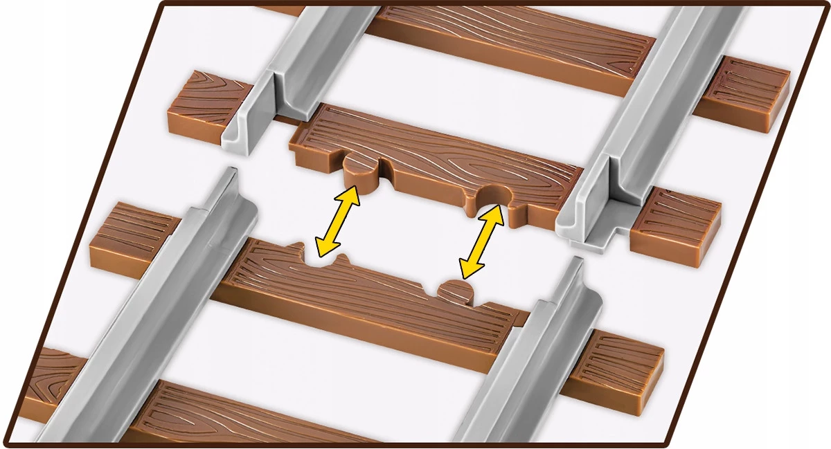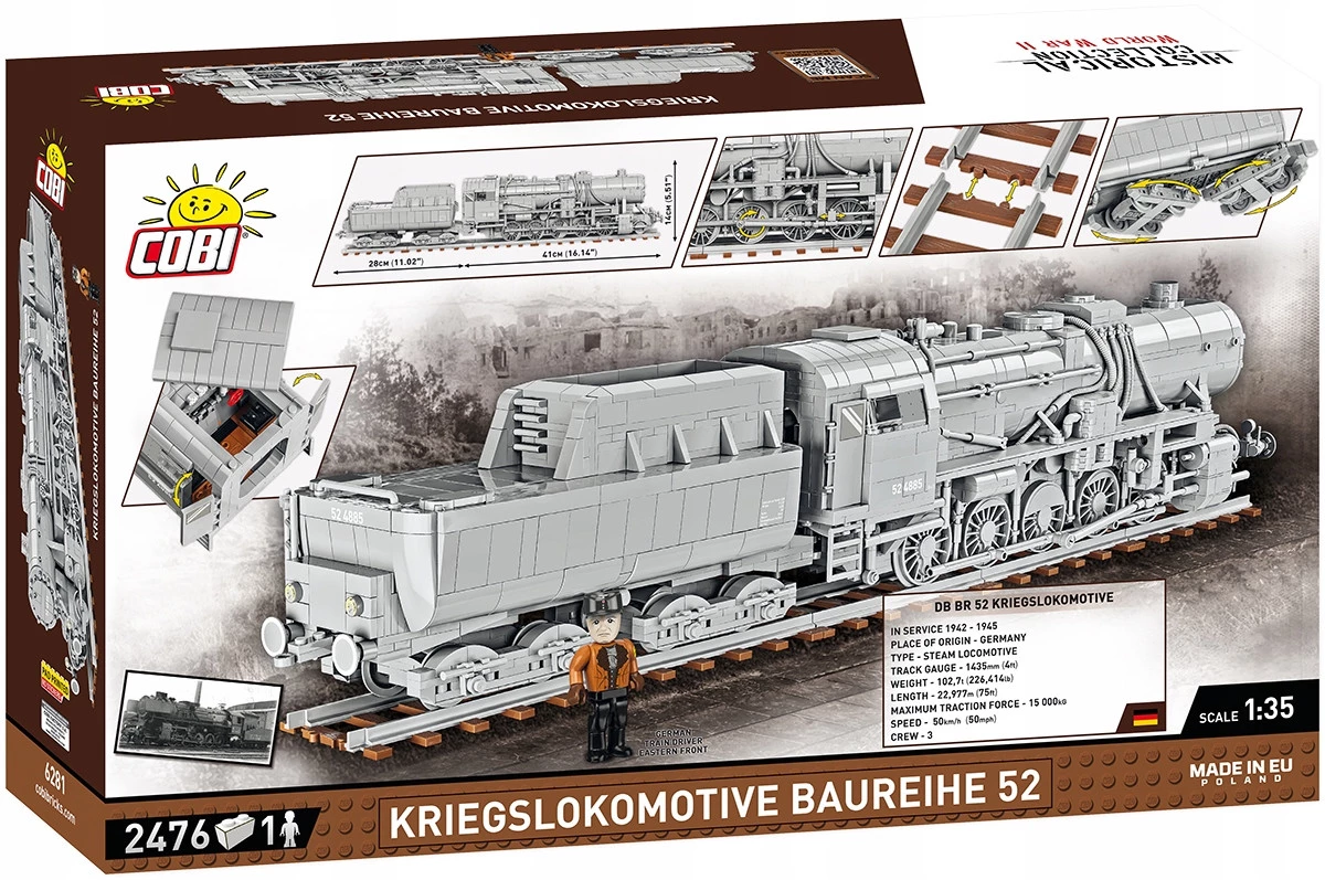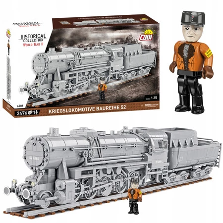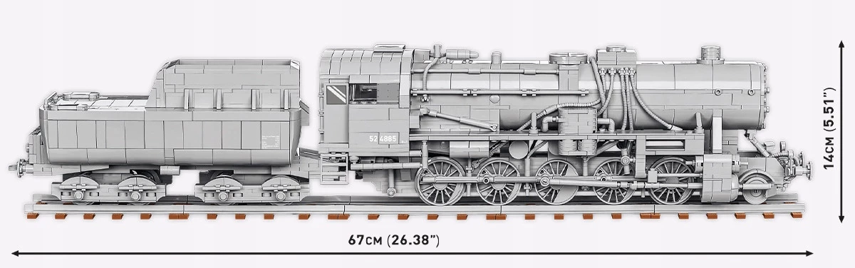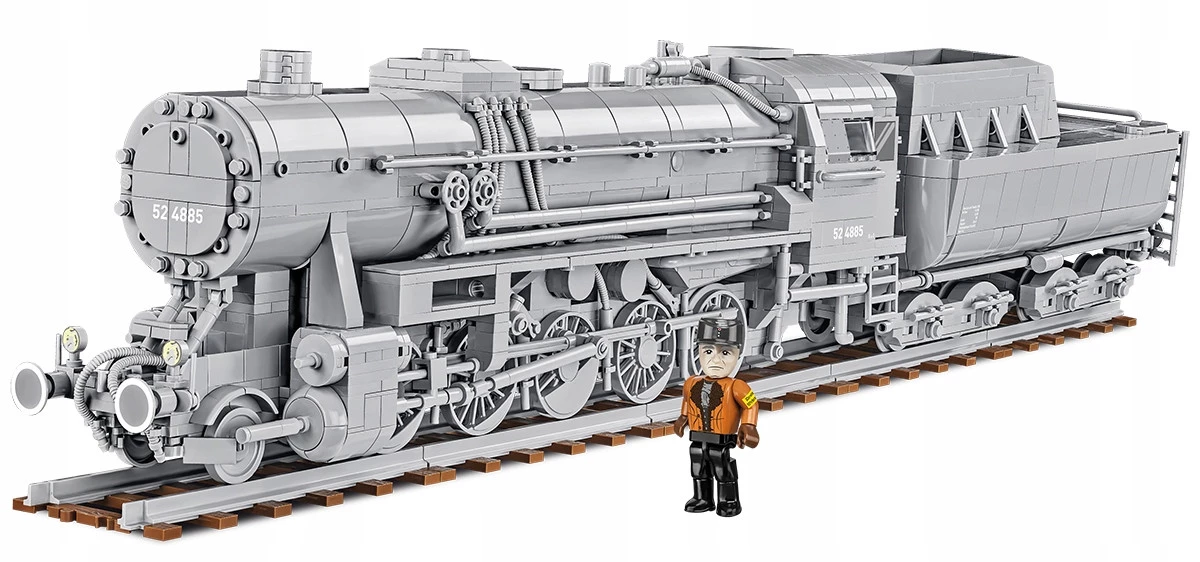 Tender, czyli wagon do przewozu między innymi węgla również wiernie odzwierciedla rzeczywisty pierwowzór. Wewnątrz posiada odwzorowany skład paliwa. Posiada również skrętne wózki kół oraz specjalny zaczep, do którego można dołączyć kolejne wagony tworząc cały skład.W zestawie dostępnych jest także pięć odcinków toru prostego o łącznej długości około 65 cm. Torowisko wykonane jest w nowoczesnej technologii dwukolorowego wtrysku, co sprawia, że każdy pojedynczy odcinek o długości około 13 cm będąc jednym elementem - monolitem, wyprodukowany jest z dwóch różnych kolorów tworzywa, które są połączone ze sobą. Szyny w kolorze szarej stali wyraźnie odcinają się od bardzo realistycznie wykonanych podkładów kolejowych w kolorze brązowym. Na każdym kolejowym podkładzie nie ma widocznych czopów (studów), co poprawia ich realizm, a każdy z nich pokryty jest fakturą deski, czyli imitacją słojów drewna. Torowiska mają możliwość wpięcia ich w płyty konstrukcyjne oraz posiadają otwór techniczny, dzięki któremu można przytwierdzić torowisko na stałe do dioramy kolejowej np. używając wkrętu lub gwoździka.Ten zestaw to idealny prezent dla każdego pasjonata historii i kolejnictwa.Buduj historię, klocek po klocku!BR 52 to parowóz towarowy konstrukcji niemieckiej, produkowany w wielu fabrykach europejskich w latach 1942–1945. Była to bardzo tania, prosta, a jednocześnie bardzo niezawodna lokomotywa parowa. Lokomotywa potrafiła uciągnąć składy towarowe o łącznej masie nawet 620 ton z prędkością 80 km/h lub 1700 ton z prędkością 50 km/h. Parowóz ten używano również wielokrotnie do ciągnięcia składów osobowych.