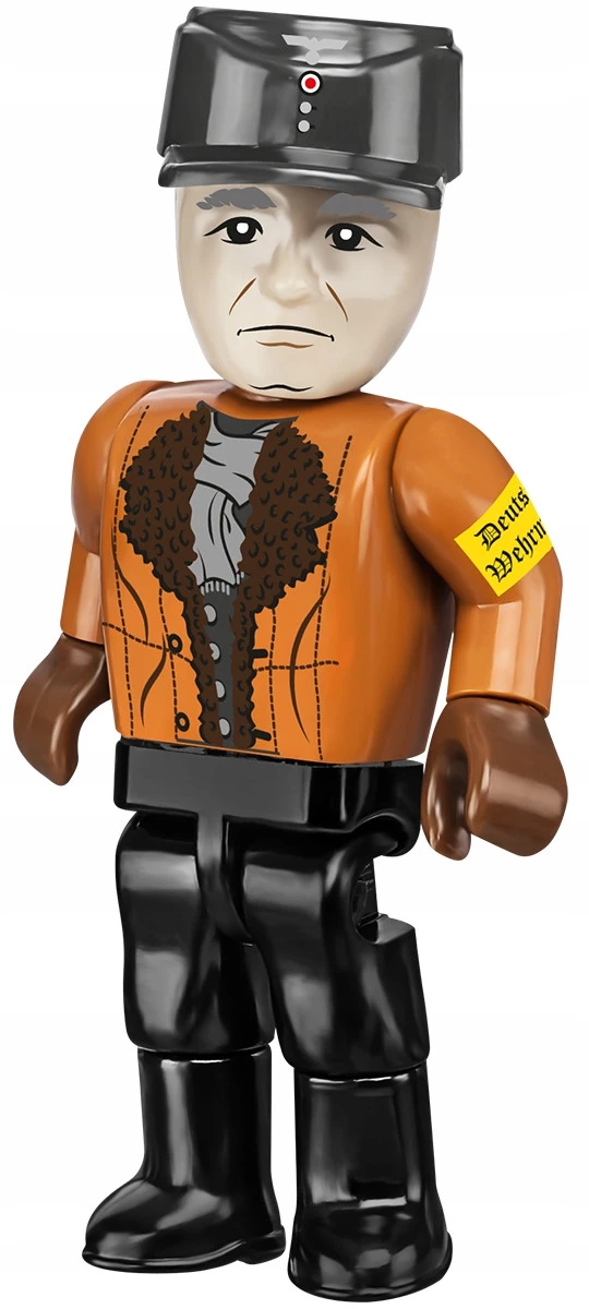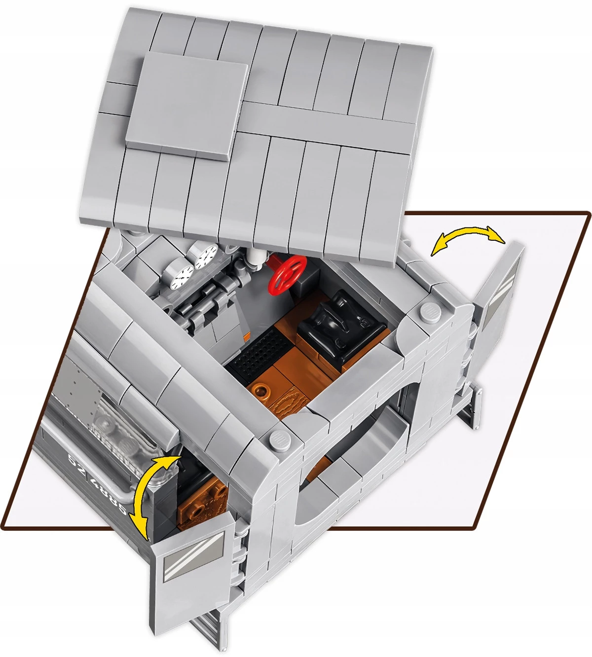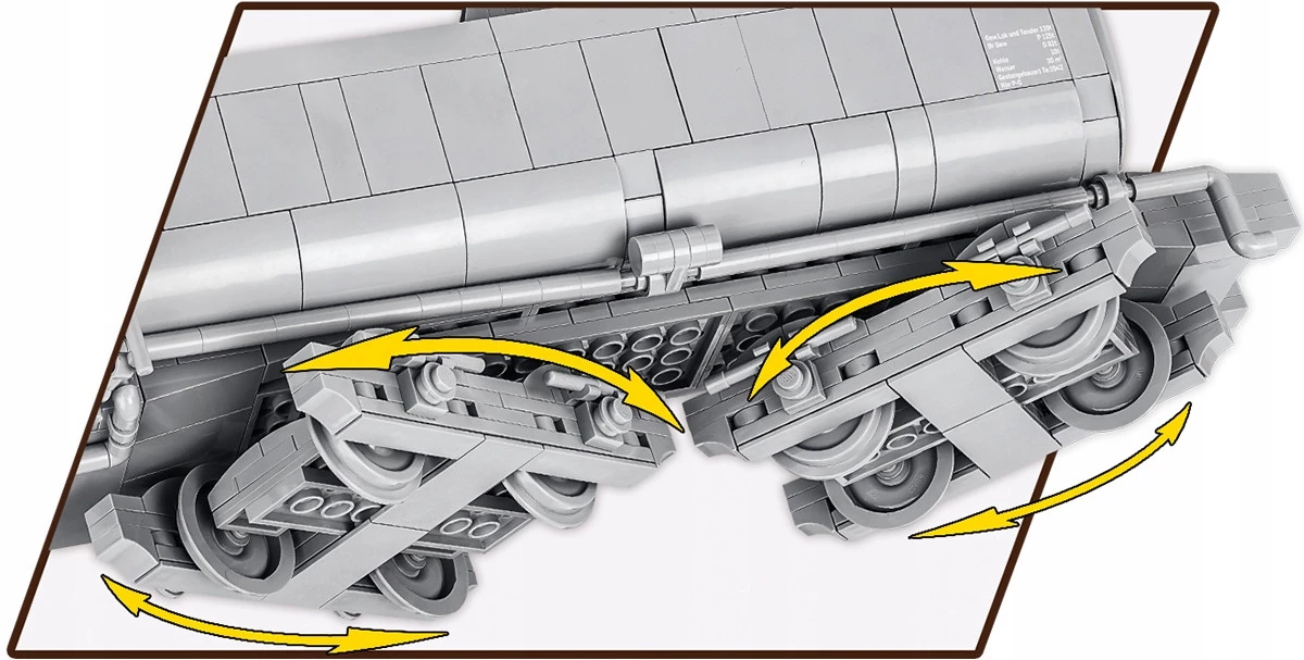 Zestaw z wyjątkowym, klockowym modelem niemieckiej lokomotywy parowej Kriegslokomotive Baureihe 52 z okresu II wojny światowej to element nowej kolekcji “Pociągi” w ofercie firmy COBI. Konstrukcja z klocków idealnie odwzorowuje całą bryłę, proporcje i detale legendarnego parowozu, który jest chyba najpopularniejszym i najbardziej rozpoznawalnym dla wszystkich pasjonatów kolejnictwa na świecie.Na uwagę z pewnością zwraca wyjątkowy kamuflaż pojazdu. Lokomotywa wydana jest w szarym kolorze, który odpowiada sposobowi malowania niemieckich lokomotyw wojskowych na Froncie Wschodnim podczas inwazji Niemiec na Związek Radziecki. W zestawie dostępna jest także specjalna figurka niemieckiego maszynisty wojskowego. Model lokomotywy w skali 1:35 oprócz szczegółowo odwzorowanych detali takich jak: symbole, numeracja i oznaczenia, posiada dodatkowe, liczne nadruki “zegarów” wewnątrz maszynowni lokomotywy. Dzięki łatwo zdejmowanemu dachowi maszynowni można zajrzeć do środka, by zobaczyć wiernie odwzorowane szczegóły urządzeń służących do kierowania pojazdem. Zadbano także o taki szczegół jak imitacja płonącego węgla w palenisku!Tak jak w prawdziwej lokomotywie parowej cały mechanizm kół jest ze sobą sprzęgnięty w ten sposób, że porusza się równocześnie. Wewnątrz modelu znajdują się koła zębate tworzące skomplikowany mechanizm zapewniający realistyczny ruch kół całego napędu. Wystarczy delikatnie popchnąć model, by poruszyć cały układ.Aż pięć różnych wzorów kół w lokomotywie, z których część zawiera ranty, czyli specjalne krawędzie, sprawia, że model świetnie utrzymuje się na klockowych torach, a także jest w stanie pokonywać klockowe zakręty o skali nachylenia od R88. Warto dodać, że model jest w pełni kompatybilny, czyli pasuje do klockowych torów innych marek klocków.