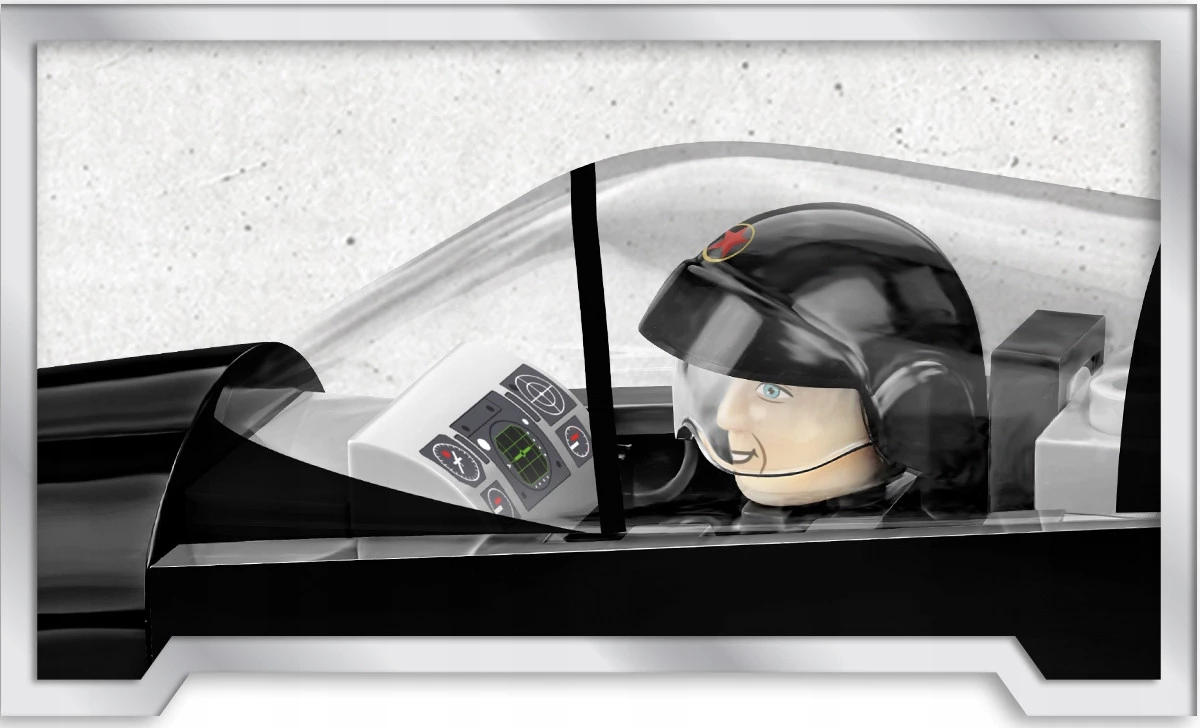 Kabina pilota jest otwierana i można w niej umieścić uproszczoną figurkę ubraną w kask z charakterystyczną filmową czerwoną gwiazdą zamkniętą w żółtym okręgu! W komplecie znajduje się klockowa podstawka ekspozycyjna oraz tabliczka z nazwą zawierająca logotyp filmu Top Gun!