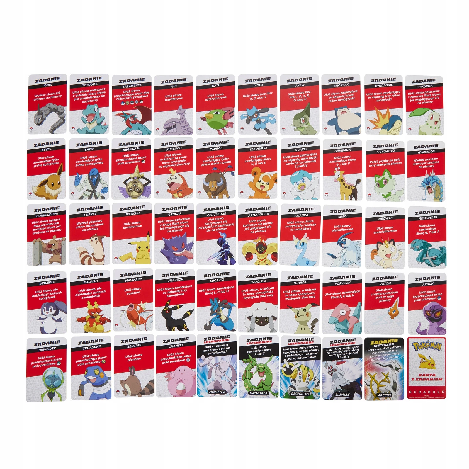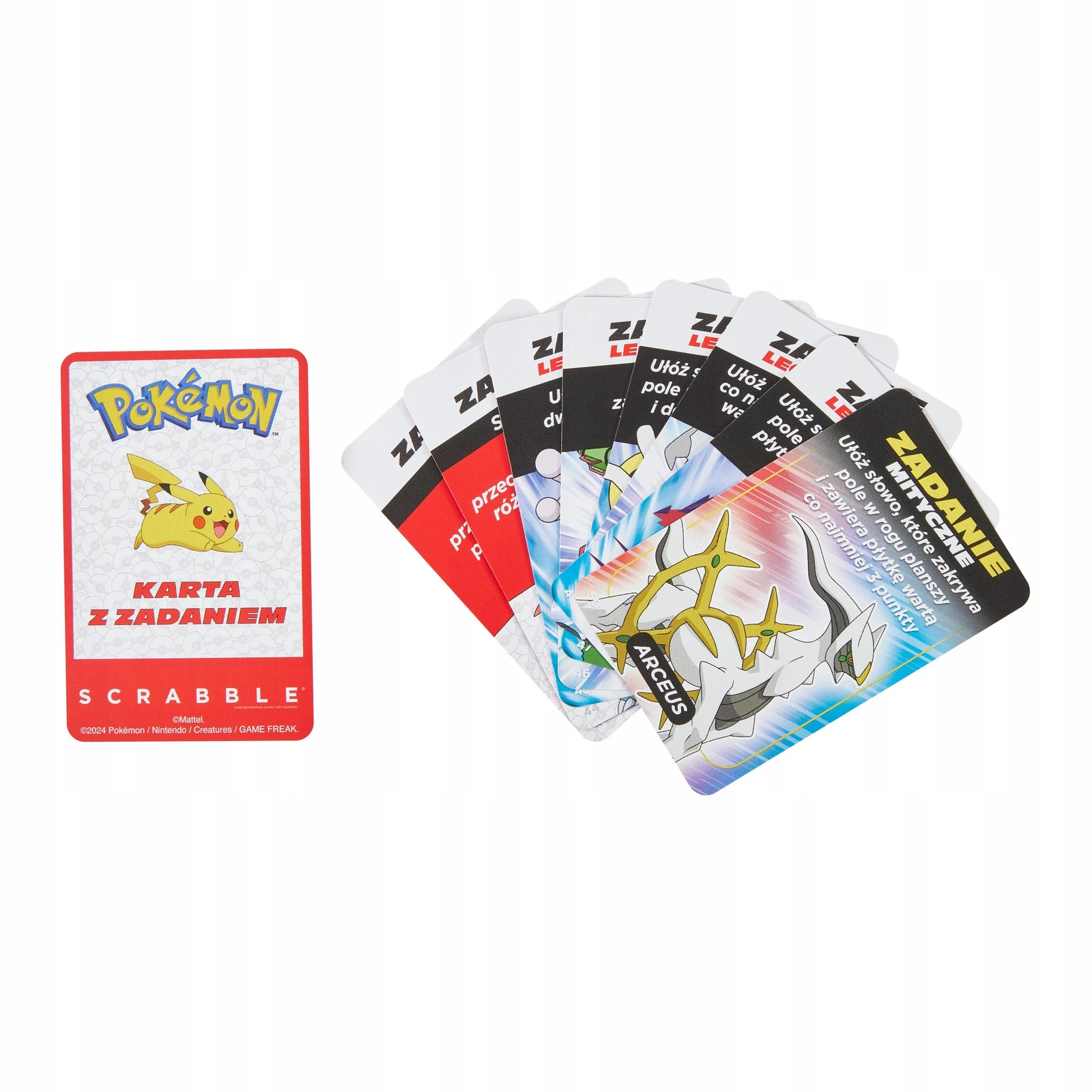 ➡️W wersji Scrabble® Pokémon razem łapiecie Pokémony, wykonując zadania z 50 kart.