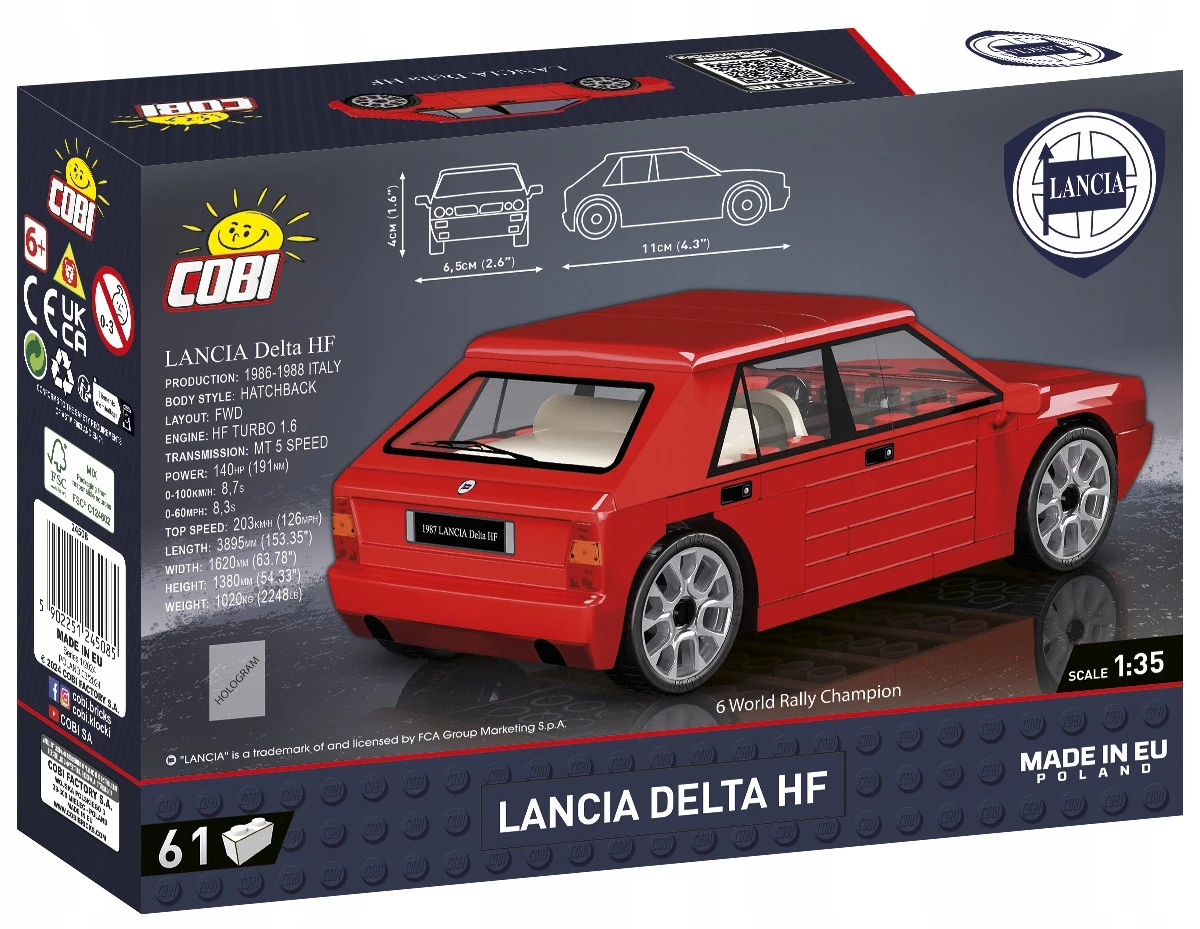 Włoska Lancia dołączyła do naszej motoryzacyjnej rodziny COBI. Lancia Delta HF z 1987 roku to ikona rajdów samochodowych. Model ten zdominował Mistrzostwa Świata Rajdów (WRC), zdobywając 46 zwycięstw i sześć tytułów mistrzowskich konstruktorów z rzędu (1987-1992). Auto wyróżnia charakterystyczny, aerodynamiczny design z agresywnym przednim wlotem powietrza i charakterystycznym tyłem. Delta została wyposażona w silnik benzynowy z turbodoładowaniem. W zależności od wersji moc wahała się od 130 do 165 koni mechanicznych.Kultowe auto zbudowaliśmy w skali 1:35 idealnie pasującej do naszej kolekcji klasyków! Prosta konstrukcja, wysokiej jakości nadruki i obracające się koła to przepis na świetnie wyglądający model, który zachwyci fanów motoryzacji niezależnie od wieku!