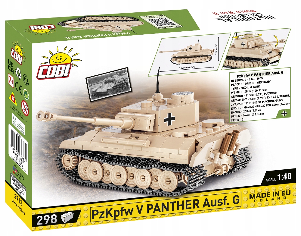 Klockowa Pantera została odwzorowana z dbałością o szczegóły w modelarskiej skali 1:48. Posiada ruchome elementy takie jak: wieża i lufa działa oraz obracające się koła i gąsienice. Zaletą zestawu składającego się z 298 elementów jest solidna konstrukcja, która wiernie odzwierciedla oryginalne kształty swego historycznego pierwowzoru. Nasz miniaturowy czołg został pokryty wysokiej jakości nadrukami, które się nie ścierają. Pantera uzupełnia naszą serię miniaturowych czołgów wykonanych w skali 1:48, które zmieszczą się w każdej kolekcji fana historii i techniki wojskowej zbudowanej z polskich klocków konstrukcyjnych COBI.