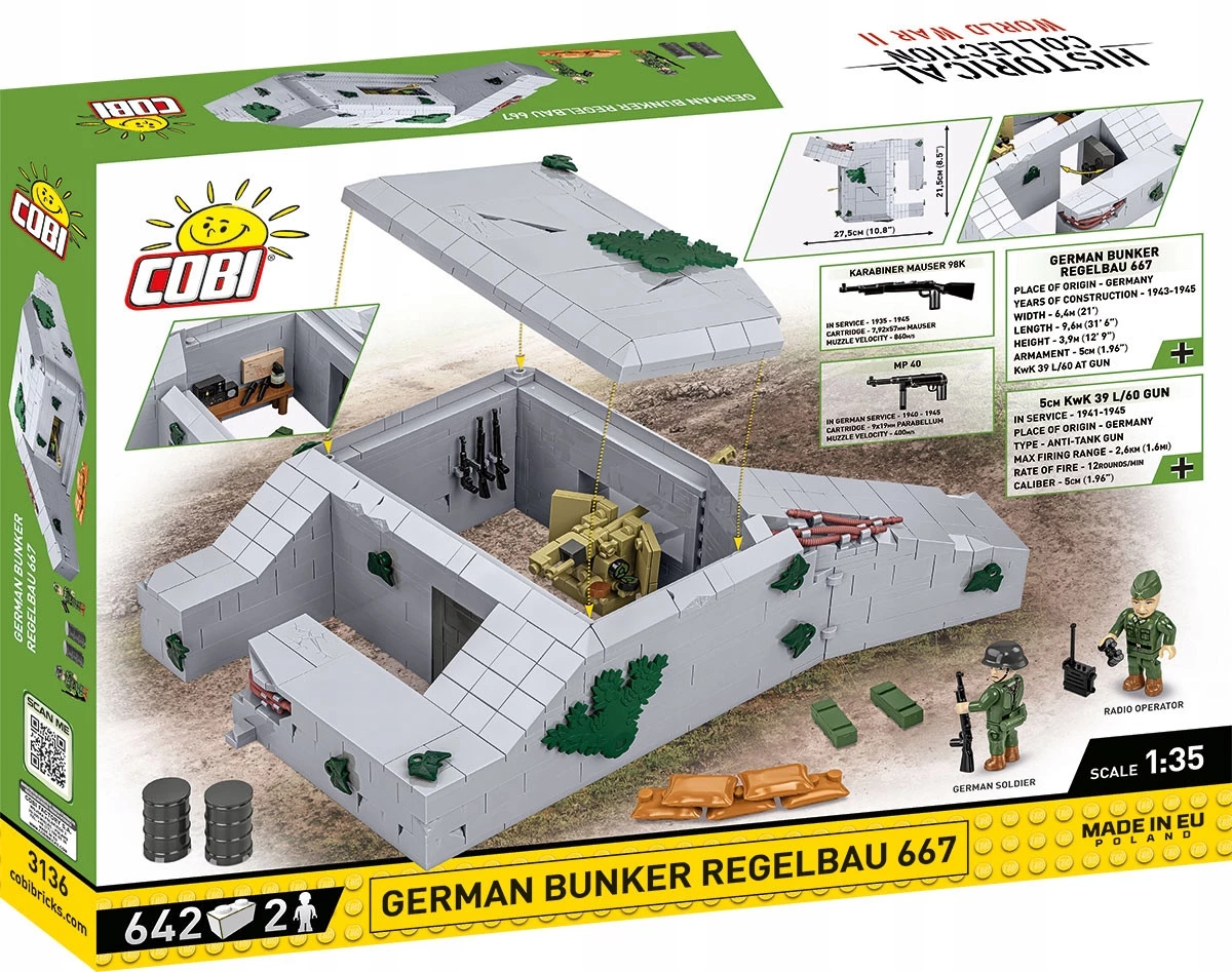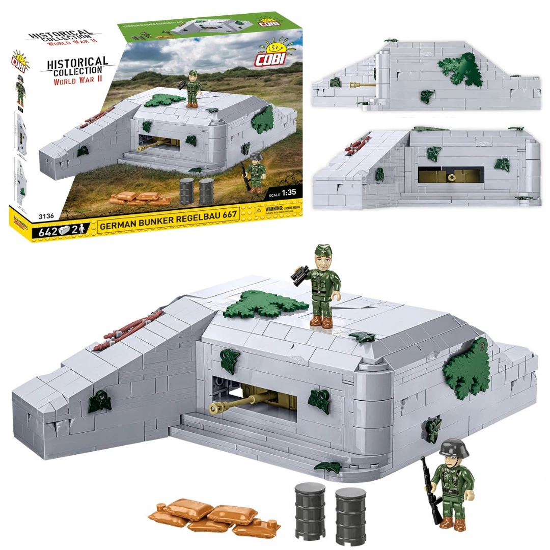Zestaw COBI Regelbau 667 to doskonała okazja, by połączyć pasję do historii i klockowego modelarstwa. Dzięki temu masz szansę nie tylko zbudować imponujący, szczegółowy model bunkra, ale również zgłębić historię jednej z najbardziej rozpoznawalnych fortyfikacji II wojny światowej.