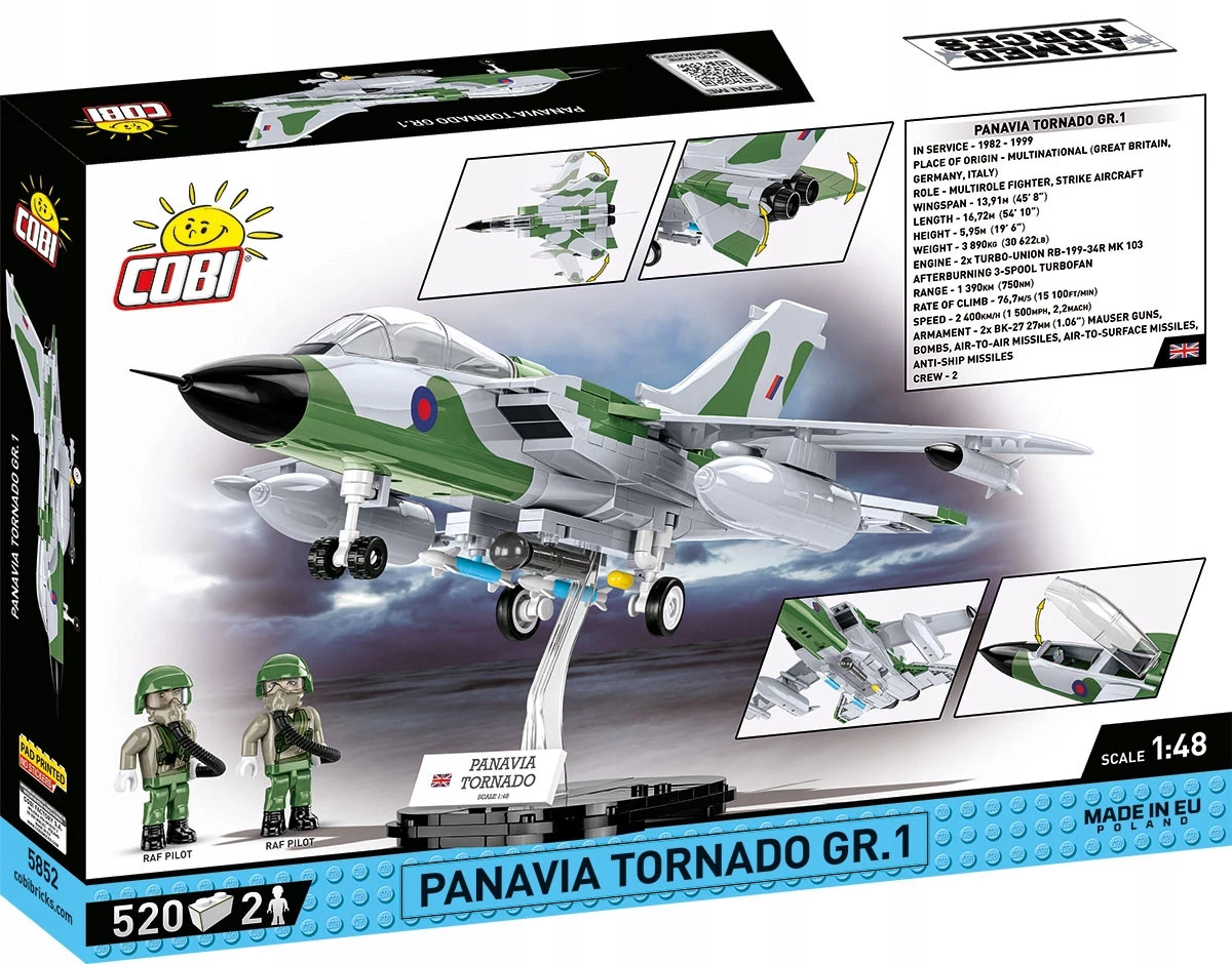 Z 520 wysokiej jakości klocków konstrukcyjnych COBI wybudujesz wielozadaniowy myśliwiec Panavia Tornado w barwach brytyjskiego RAF (Royal Air Force). Zestaw został starannie zaprojektowany w modelarskiej skali 1:48 i uzupełnia bardzo bogatą kolekcję myśliwców Armed Forces. W zestawie znajdują się wysokiej jakości nadruki. Nie znajdziesz tutaj naklejek! Schemat malowania samolotu jest wyrazem hołdu złożonego bohaterskim lotnikom RAF z okresu drugiej wojny światowej i naśladuje kamuflaż stosowany w tym okresie. Model tak jak oryginał posiada mechanizm umożliwiający zmianę położenia skrzydeł (zmienna geometria skrzydeł). Mamy tutaj również otwieraną kabinę z miejscem na dwie pełnowymiarowe figurki, ruchome lotki oraz koła. Podwozie można w każdej chwili w prosty sposób odczepić, aby jeszcze ładniej wyeksponować samolot na klockowej podstawce ekspozycyjnej, która jest dołączona do zestawu. Tabliczka z nazwą znajduje się w komplecie.