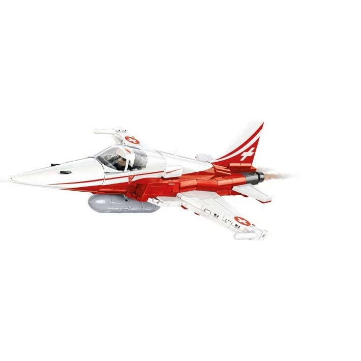 Z 351 klocków konstrukcyjnych COBI wybudujesz samolot myśliwski F-5 Tiger II w barwach słynnego zespołu akrobacyjnego Swiss Air Force Team Patrouille Suisse. Licencyjny zestaw został zbudowany na podstawie planów samolotu F-5 przy zachowaniu najwyższej dbałością o klockowe detale. Samolot posiada charakterystyczne piękne czerwone nadruki, ruchome lotki oraz odpinane podwozie. Kabina jest otwierana i można w niej umieścić uproszczoną figurkę pilota z kaskiem zawierającym nadruk. W komplecie znajduje się klockowa podstawka ekspozycyjna oraz tabliczka zawierająca nazwę, skalę samolotu oraz flagę Szwajcarii. Model w skali 1:48 uzupełnia kolekcję samolotów wydanych w ramach kolekcji Armed Forces! Zbuduj to!