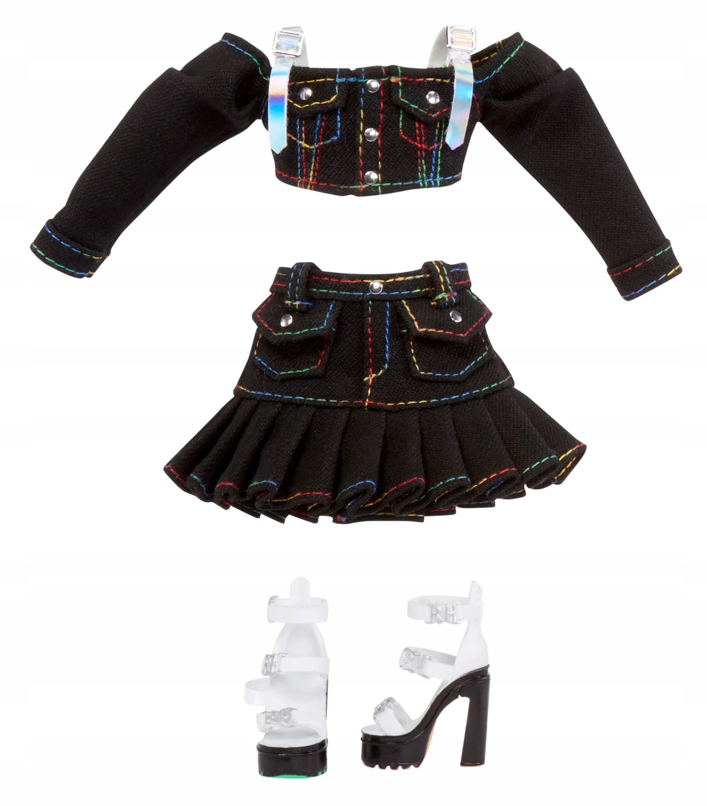 ➡️ Avery Styles ubrana jest w dopasowaną czerń z tęczową nitką w jeansowej spódnicy i topie, a na nogach ma szpilki.