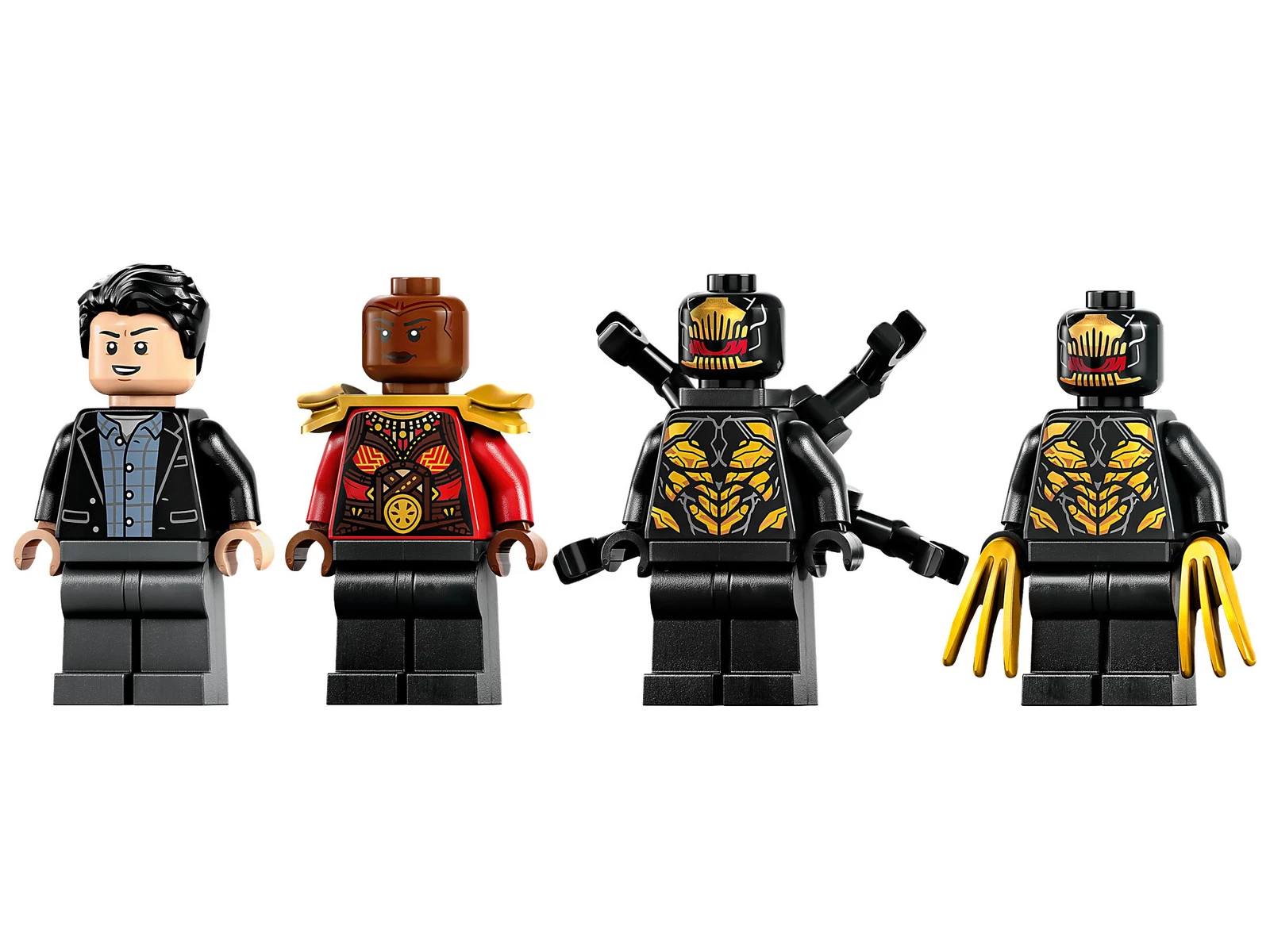 W zestawie jest Hulkbuster do zbudowania i cztery minifigurki: Bruce Banner, którego głowa obraca się i odsłania zieloną twarz, Okoye z włócznią i dwóch pomocników