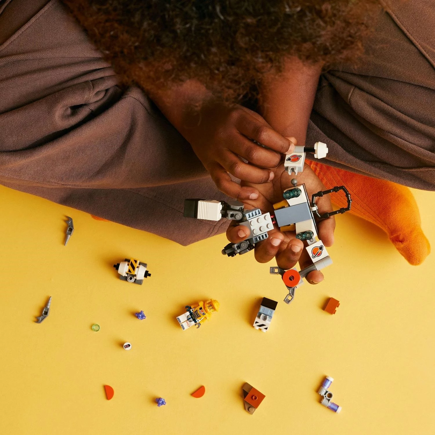 W zestawie jest wszystko, czego potrzebują dzieci do zbudowania przegubowego mecha, kosmicznego robota budowlanego, a także minifigurkę członka załogi i scenkę z planetą, skałą i kryształami