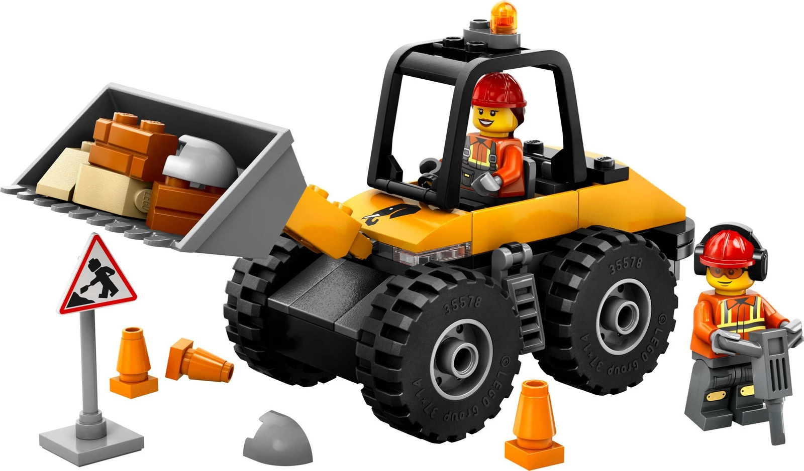 Ta zabawka zawiera ładowarkę kołową do zbudowania, minifigurki kierowcy i pracownika, znak drogowy, pachołki i zabawkowy młot pneumatyczny