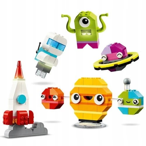 Dzieci układają kolorowe klocki, aby zbudować zabawkową rakietę, kosmitę, astronautkę i mały układ słoneczny obejmujący Marsa, Ziemię, Słońce i Saturna z pierścieniami. Modele kosmiczne można następnie przebudować, korzystając z innych kolorów, kształtów, oczu, min i podstawki, dzięki której można obracać model. W zestawie są także klocki świecące w ciemności. Kosmiczna kreatywność nie musi się kończyć, bo dzieci mogą przebudować modele na układ słoneczny składający się z ośmiu planet.