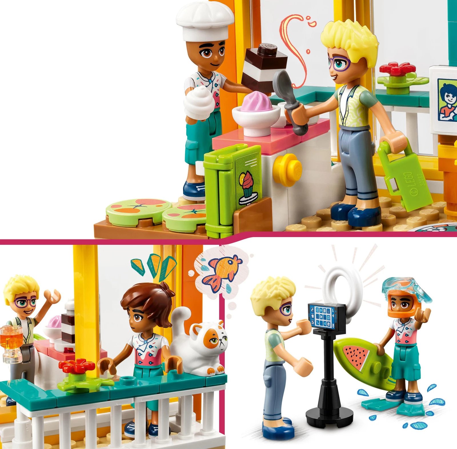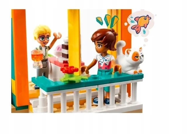 Zestaw zawiera minilaleczki LEGO Friends – Leo i Olly’ego, a także kota, Churro