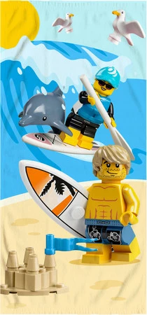 ➡️Ręcznik zachwyca dynamiczną, radosną grafiką z motywem plażowo-surferskim, inspirowanym kultowymi figurkami LEGO.