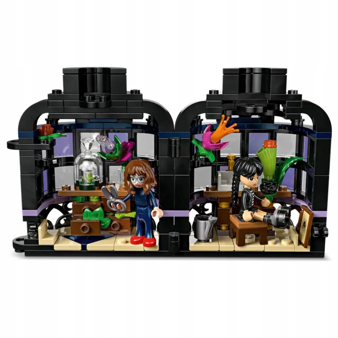 Ten zestaw do zbudowania można zamknąć za pomocą kwiatu czarnej dalii, a po jego otwarciu ukazują się detale z serialu Wednesday, co daje nieograniczone możliwości opowiadania historii