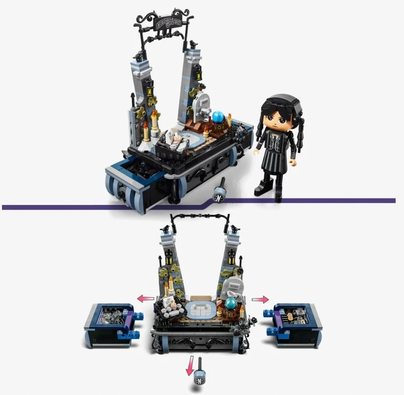 ➡️Zestaw pełen tajemnic — zawiera zbudowaną z klocków figurkę Wednesday z dwiema twarzami i dwiema stylizacjami, a także postać Rączki, podstawkę z dwoma zamykanymi skrytkami i rozmaite akcesoria